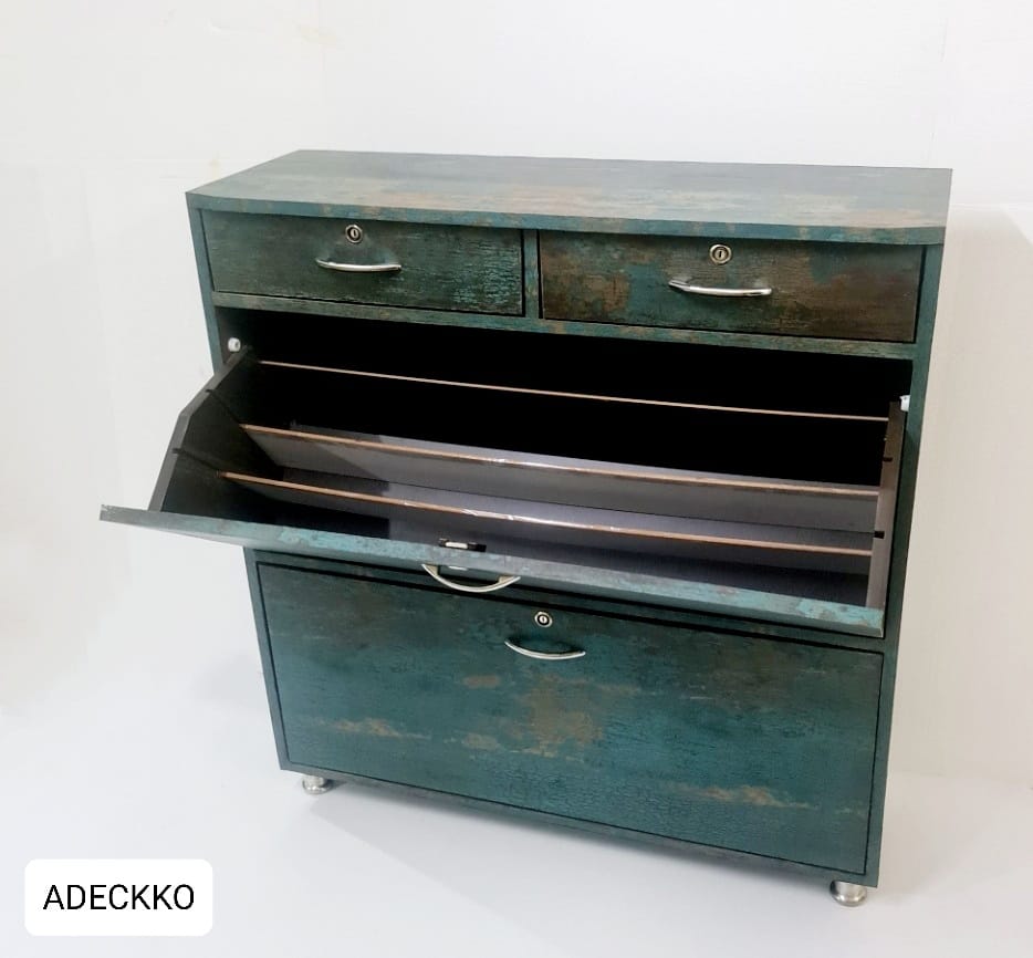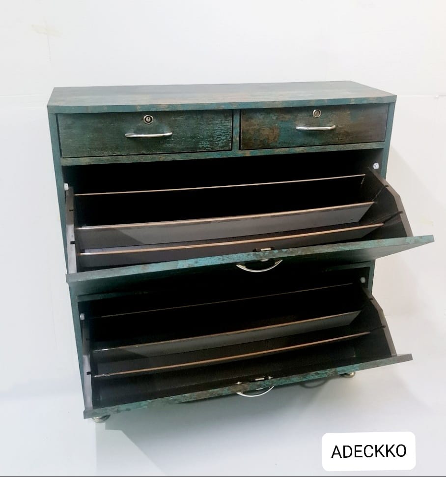 Offering ample space to stash up to 30 pair of shoes, this storage cabinet is the perfect organizing solution for a cluttered entryway or bedroom. It Crafted from high quality plywood, this budget-friendly piece features two compartments for shoes and two drawers . Material : PLYWOOD + LAMINATE Dimensions : Height : 40 inches Width : 40 inches Depth : 13 inches. Pre-assembled - NO Assembly Required. For customization contact us at 9999320028