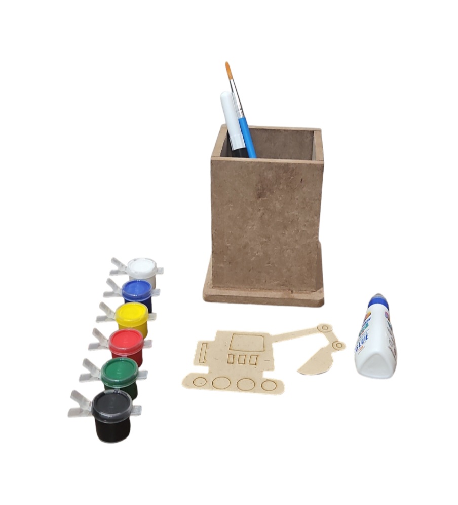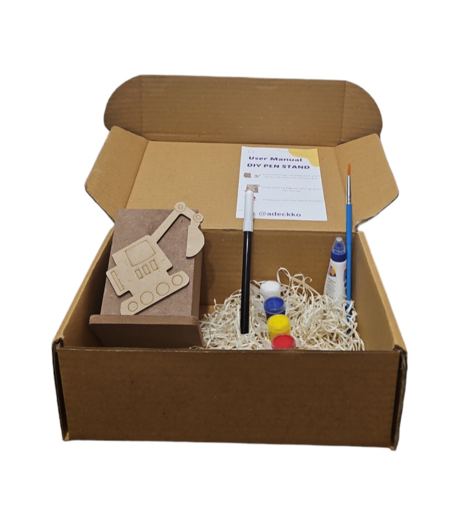 Dig into productivity with a creative DIY Excavator pen stand. Unleash your creativity and organizational skills with the Adeckko DIY Construction Vehicle Theme Coloring Kit. This unique and fun kit combines the joy of building with the therapeutic benefits of coloring, creating a personalized and functional pen stand that reflects your style. Kit Includes: Excavator -Themed Pen Stand & Cut Out : Pre Assembeld pen stand & Cutout. Coloring Markers: A set of vibrant, high-quality markers for coloring the pen stand pieces, allowing you to customize your creation. Instruction Sheet : Step-by-step instructions to guide. Customize your pen stand with your favorite colors and designs. Durable Materials : Made from high-quality MDF, durable materials to ensure your pen stand lasts. Gift: Perfect for kids, students, artists, and anyone who loves DIY projects. Compact Design: Ideal for desks, study areas, or any workspace that needs a touch of personalization and organization.Create a one-of-a-kind pen stand that not only keeps your pens, pencils, and markers in order but also adds a playful and colorful touch to your workspace. The Adeckko DIY construction vehicle Theme Coloring Kit is the perfect blend of fun and function. Get yours today and start building your creativity! For Customisation contact 9999320028