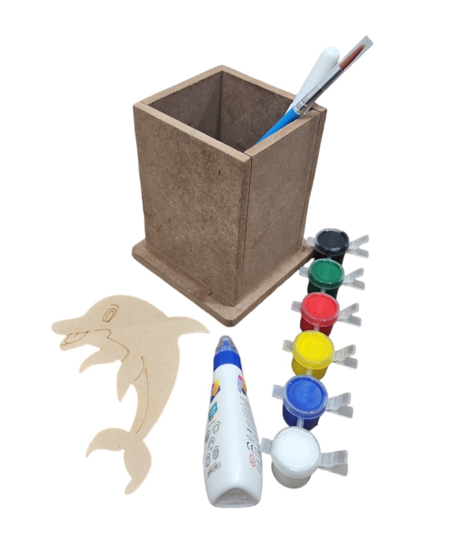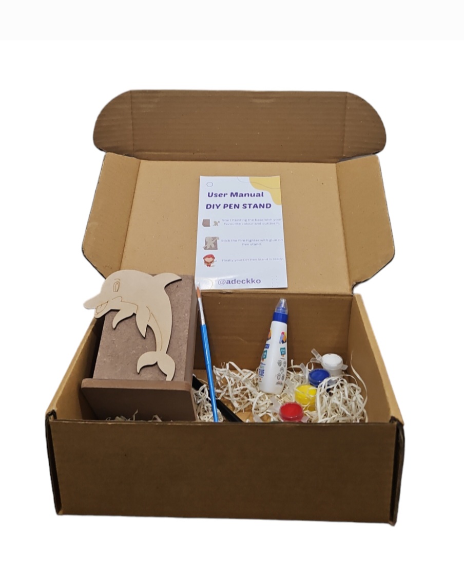 Adeckko DIY Pen Stand Dolphin Theme Coloring Kit. Unleash your creativity and organizational skills with the Adeckko DIY Pen Stand Dolphin Theme Coloring Kit. This unique and fun kit combines the joy of building with the therapeutic benefits of coloring, creating a personalized and functional pen stand that reflects your style. Kit Includes: Dolphin -Themed Pen Stand & Cut Out : Pre Assembeld pen stand & Cutout. Coloring Markers: A set of vibrant, high-quality markers for coloring the pen stand pieces, allowing you to customize your creation. Instruction Sheet : Step-by-step instructions to guide. Customize your pen stand with your favorite colors and designs. Durable Materials : Made from high-quality MDF, durable materials to ensure your pen stand lasts. Gift: Perfect for kids, students, artists, and anyone who loves DIY projects and Wild Animals-themed items. Compact Design: Ideal for desks, study areas, or any workspace that needs a touch of personalization and organization.Create a one-of-a-kind pen stand that not only keeps your pens, pencils, and markers in order but also adds a playful and colorful touch to your workspace. The Adeckko DIY Pen Stand Dolphin Theme Coloring Kit is the perfect blend of fun and function. Get yours today and start building your creativity! For Customisation contact 9999320028