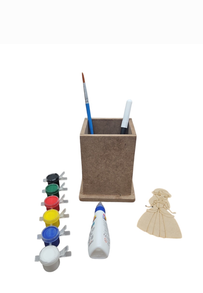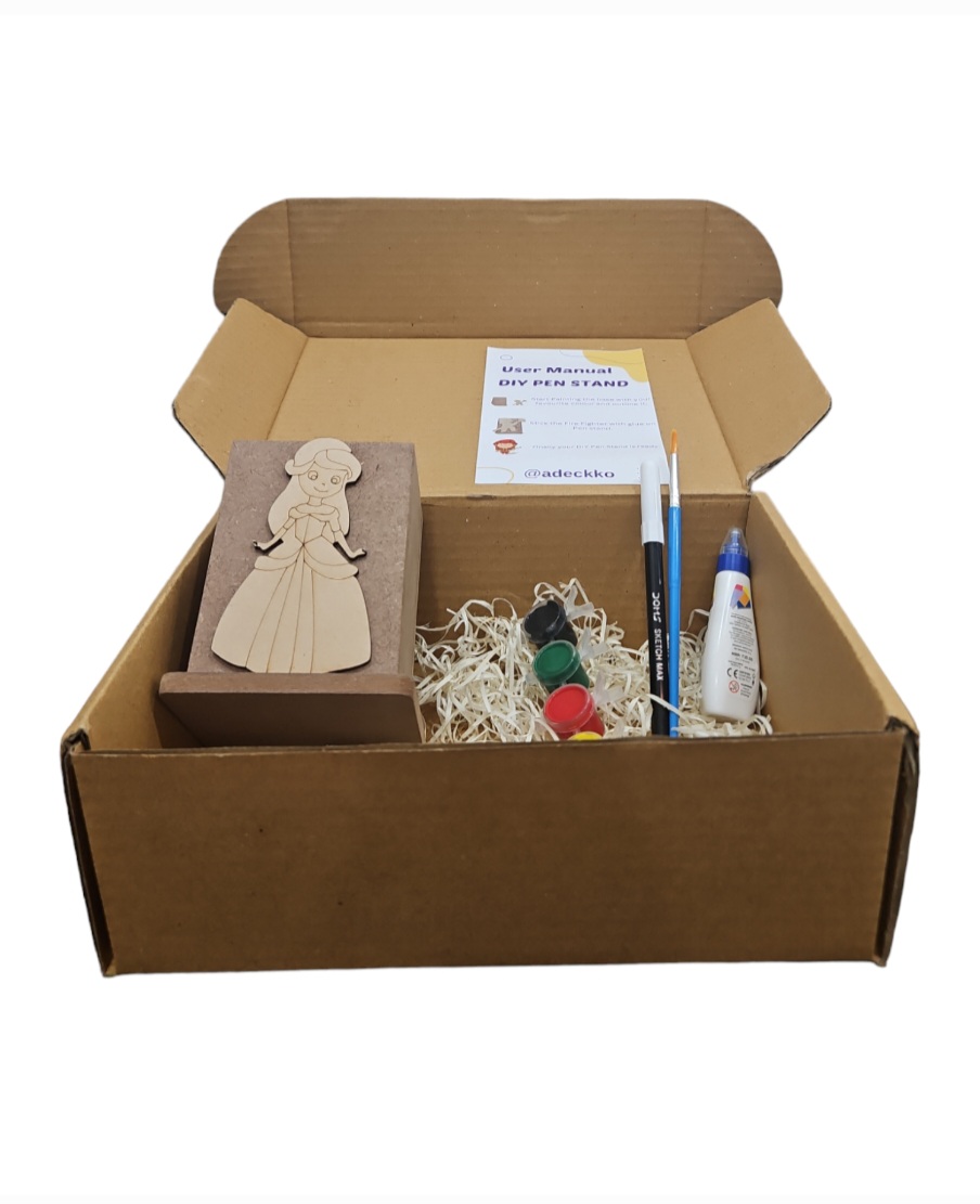 Adeckko DIY Pen Princess Theme Coloring Kit. Unleash your creativity and organizational skills with the Adeckko DIY Pen Stand Princess Theme Coloring Kit. This unique and fun kit combines the joy of building with the therapeutic benefits of coloring, creating a personalized and functional pen stand that reflects your style. Kit Includes: Princess -Themed Pen Stand & Cut Out : Pre Assembeld pen stand & Cutout. Coloring Markers: A set of vibrant, high-quality markers for coloring the pen stand pieces, allowing you to customize your creation. Instruction Sheet : Step-by-step instructions to guide. Customize your pen stand with your favorite colors and designs. Durable Materials : Made from high-quality MDF, durable materials to ensure your pen stand lasts. Gift: Perfect for kids, students, artists, and anyone who loves DIY projects. Compact Design: Ideal for desks, study areas, or any workspace that needs a touch of personalization and organization.Create a one-of-a-kind pen stand that not only keeps your pens, pencils, and markers in order but also adds a playful and colorful touch to your workspace. The Adeckko DIY Pen Stand Princess Theme Coloring Kit is the perfect blend of fun and function. Get yours today and start building your creativity! For Customisation contact 9999320028