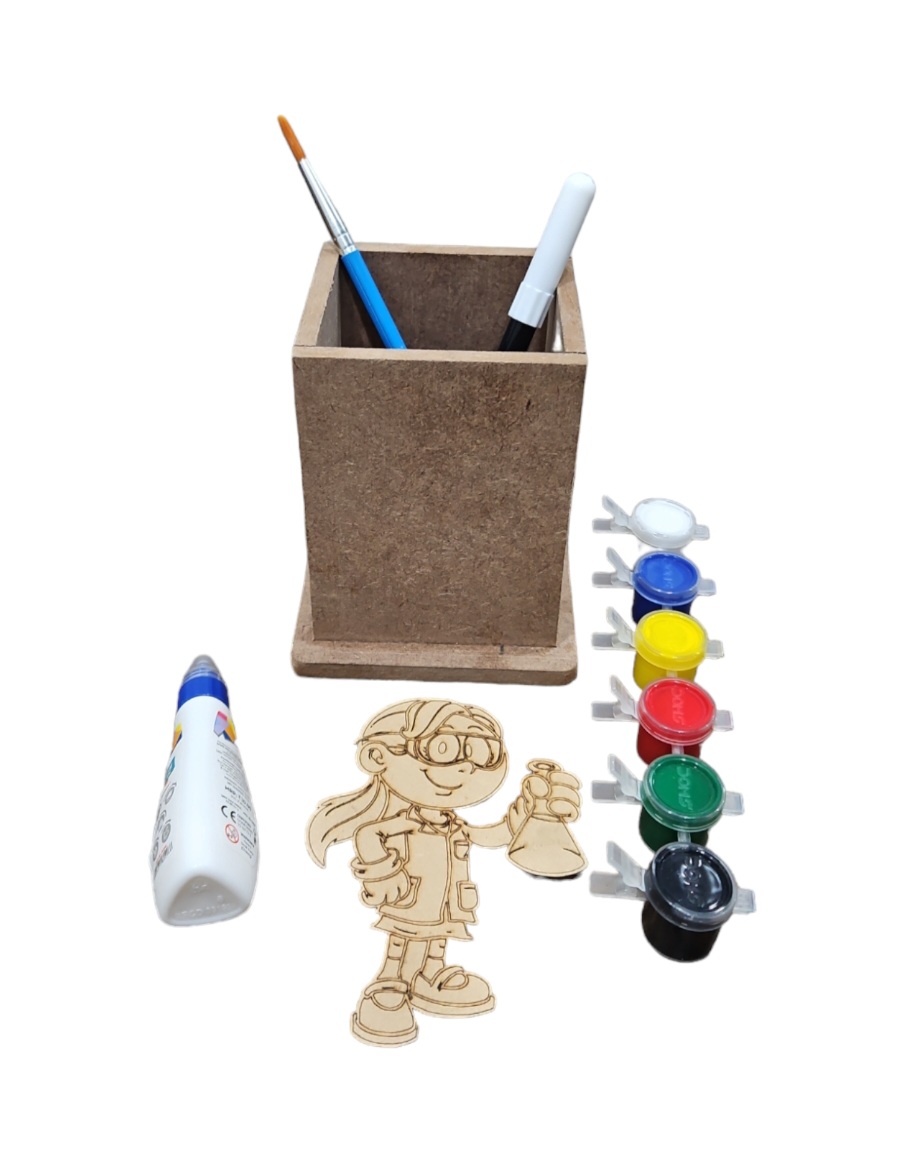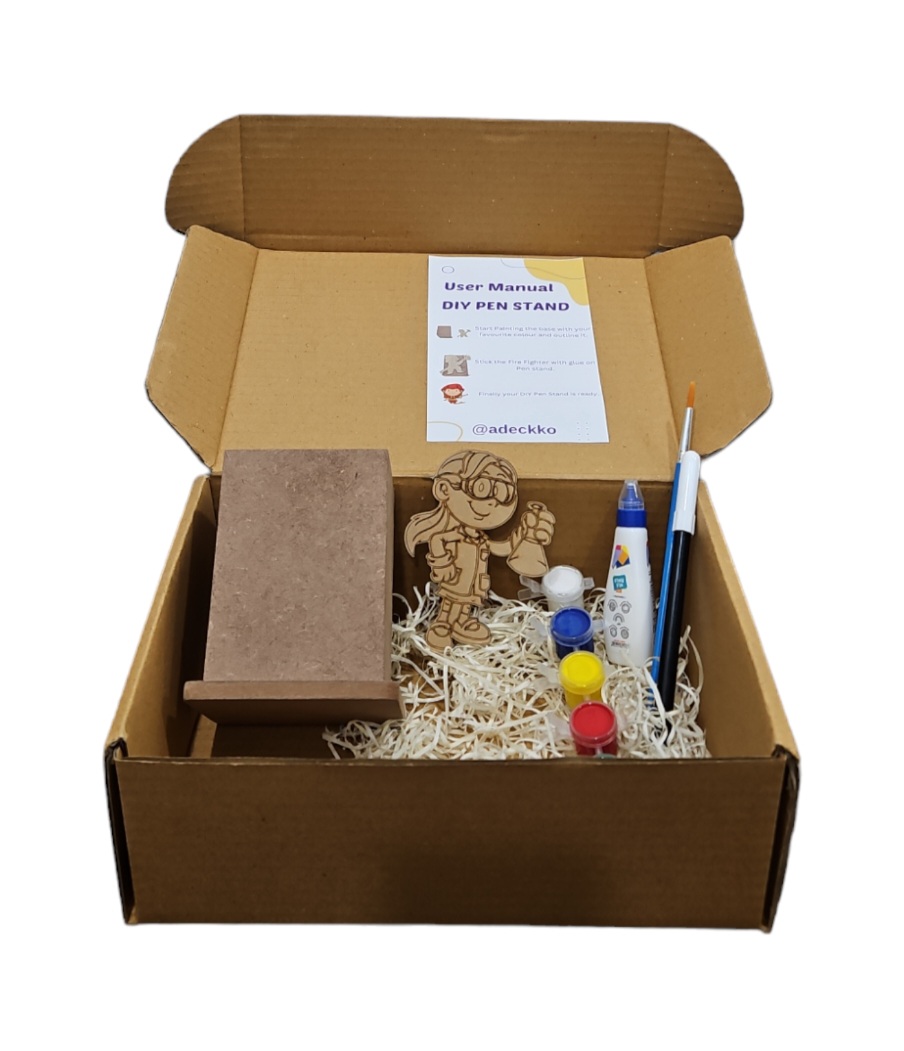 Get crafty with our Science Kid DIY pen stand kit—perfect for budding scientists Unleash your creativity and organizational skills with the Adeckko DIY Pen Stand Science Theme Coloring Kit. This unique and fun kit combines the joy of building with the therapeutic benefits of coloring, creating a personalized and functional pen stand that reflects your style. Kit Includes: Science Kid -Themed Pen Stand & Cut Out : Pre Assembeld pen stand & Cutout. Coloring Markers: A set of vibrant, high-quality markers for coloring the pen stand pieces, allowing you to customize your creation. Instruction Sheet : Step-by-step instructions to guide. Customize your pen stand with your favorite colors and designs. Durable Materials : Made from high-quality MDF, durable materials to ensure your pen stand lasts. Gift: Perfect for kids, students, artists, and anyone who loves DIY projects. Compact Design: Ideal for desks, study areas, or any workspace that needs a touch of personalization and organization.Create a one-of-a-kind pen stand that not only keeps your pens, pencils, and markers in order but also adds a playful and colorful touch to your workspace. The Adeckko DIY Pen Science Theme Coloring Kit is the perfect blend of fun and function. Get yours today and start building your creativity! For Customisation contact 9999320028