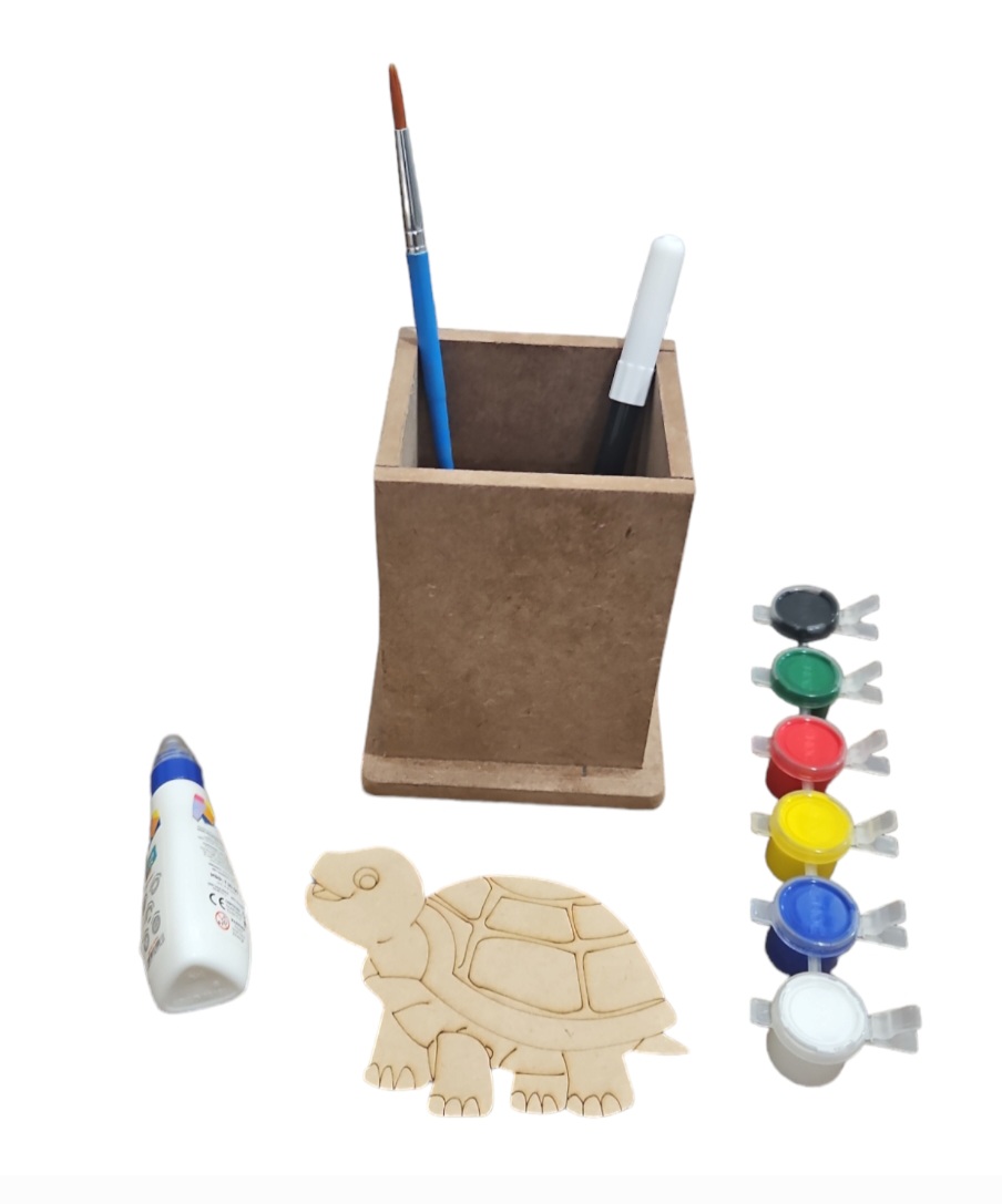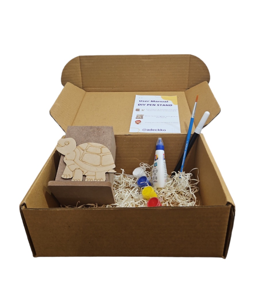 Adeckko DIY Pen Tortoise Theme Coloring Kit. Unleash your creativity and organizational skills with the Adeckko DIY Pen Stand Tortoise Theme Coloring Kit. This unique and fun kit combines the joy of building with the therapeutic benefits of coloring, creating a personalized and functional pen stand that reflects your style. Kit Includes: Tortoise -Themed Pen Stand & Cut Out : Pre Assembeld pen stand & Cutout. Coloring Markers: A set of vibrant, high-quality markers for coloring the pen stand pieces, allowing you to customize your creation. Instruction Sheet : Step-by-step instructions to guide. Customize your pen stand with your favorite colors and designs. Durable Materials : Made from high-quality MDF, durable materials to ensure your pen stand lasts. Gift: Perfect for kids, students, artists, and anyone who loves DIY projects and Aqua Animals-themed items. Compact Design: Ideal for desks, study areas, or any workspace that needs a touch of personalization and organization.Create a one-of-a-kind pen stand that not only keeps your pens, pencils, and markers in order but also adds a playful and colorful touch to your workspace. The Adeckko DIY Pen Stand Tortoise Theme Coloring Kit is the perfect blend of fun and function. Get yours today and start building your creativity! For Customisation contact 9999320028