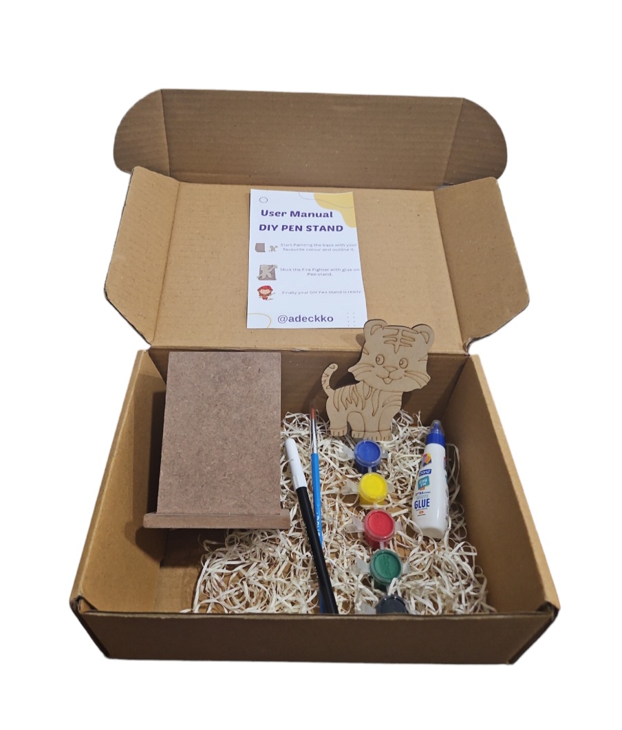 Adeckko DIY Pen Stand Cat Theme Coloring Kit. Unleash your creativity and organizational skills with the Adeckko DIY Pen Stand Cat Theme Coloring Kit. This unique and fun kit combines the joy of building with the therapeutic benefits of coloring, creating a personalized and functional pen stand that reflects your style. Kit Includes: Cat -Themed Pen Stand & Cut Out : Pre Assembeld pen stand & Cutout. Coloring Markers: A set of vibrant, high-quality markers for coloring the pen stand pieces, allowing you to customize your creation. Instruction Sheet : Step-by-step instructions to guide. Customize your pen stand with your favorite colors and designs. Durable Materials : Made from high-quality MDF, durable materials to ensure your pen stand lasts. Gift: Perfect for kids, students, artists, and anyone who loves DIY projects and Wild Animals-themed items. Compact Design: Ideal for desks, study areas, or any workspace that needs a touch of personalization and organization.Create a one-of-a-kind pen stand that not only keeps your pens, pencils, and markers in order but also adds a playful and colorful touch to your workspace. The Adeckko DIY Pen Stand Cat Theme Coloring Kit is the perfect blend of fun and function. Get yours today and start building your creativity! For Customisation contact 9999320028