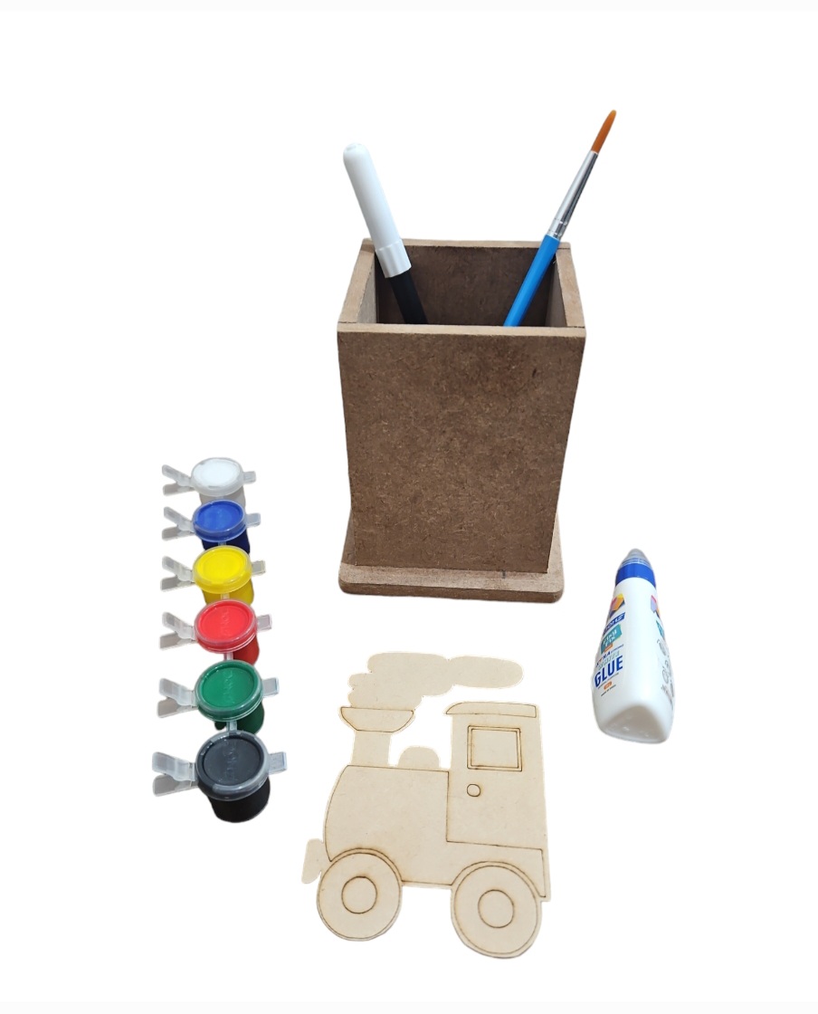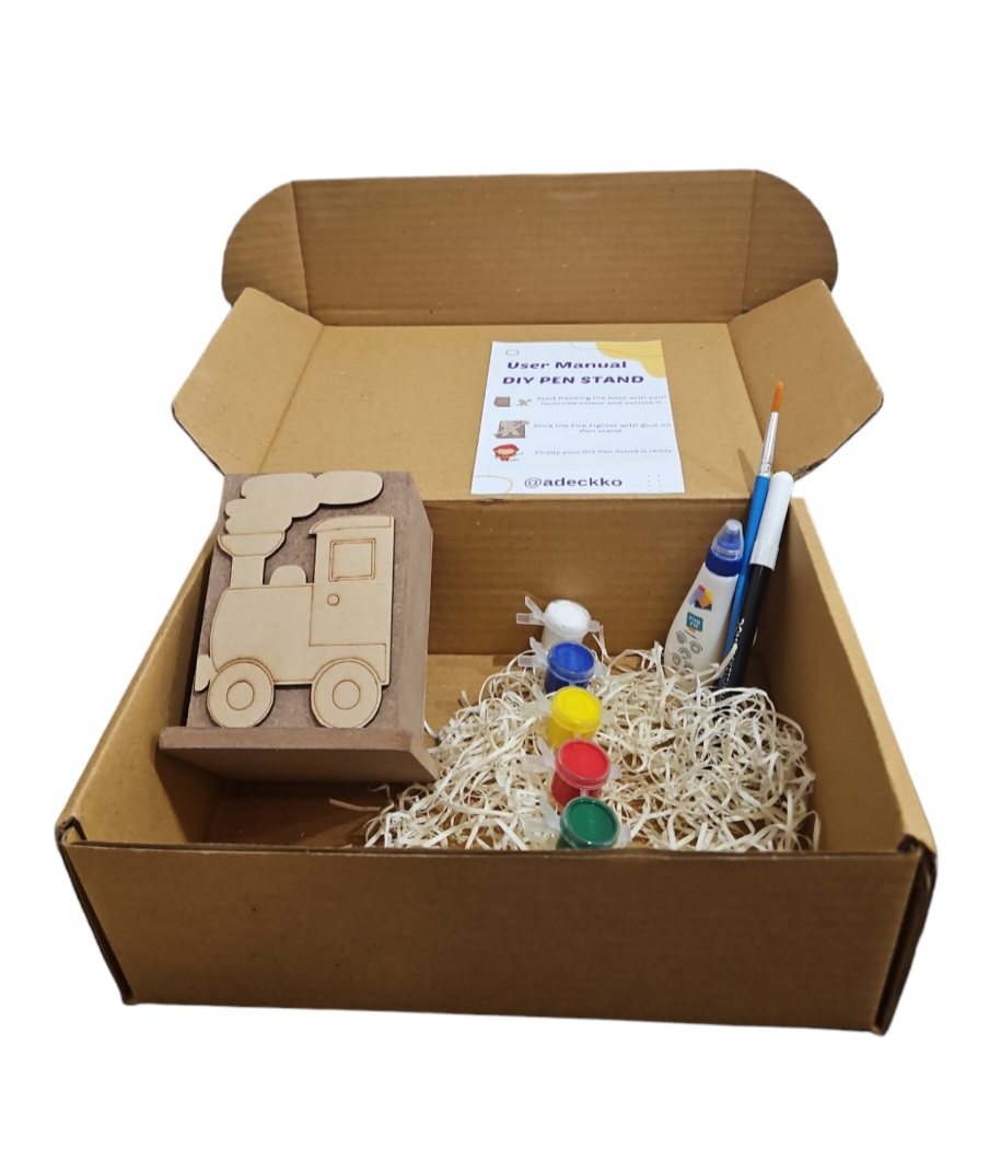 Keep your pens on track with a custom DIY train engine pen stand. Unleash your creativity and organizational skills with the Adeckko DIY Transport Theme Coloring Kit. This unique and fun kit combines the joy of building with the therapeutic benefits of coloring, creating a personalized and functional pen stand that reflects your style. Kit Includes: Engine -Themed Pen Stand & Cut Out : Pre Assembeld pen stand & Cutout. Coloring Markers: A set of vibrant, high-quality markers for coloring the pen stand pieces, allowing you to customize your creation. Instruction Sheet : Step-by-step instructions to guide. Customize your pen stand with your favorite colors and designs. Durable Materials : Made from high-quality MDF, durable materials to ensure your pen stand lasts. Gift: Perfect for kids, students, artists, and anyone who loves DIY projects. Compact Design: Ideal for desks, study areas, or any workspace that needs a touch of personalization and organization.Create a one-of-a-kind pen stand that not only keeps your pens, pencils, and markers in order but also adds a playful and colorful touch to your workspace. The Adeckko DIY Transport Theme Coloring Kit is the perfect blend of fun and function. Get yours today and start building your creativity! For Customisation contact 9999320028