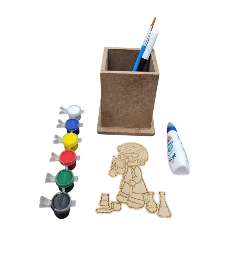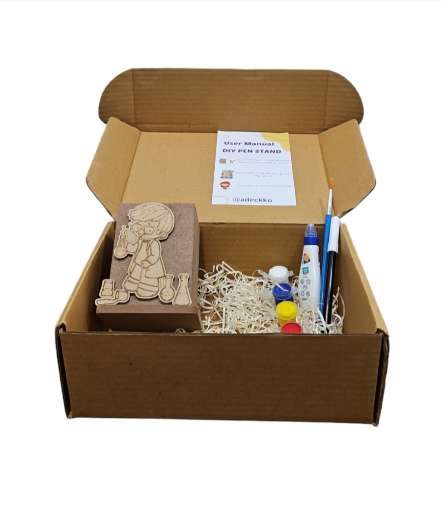 Get crafty with our Science Lab DIY pen stand kit—perfect for budding scientists Unleash your creativity and organizational skills with the Adeckko DIY Pen Stand Science Theme Coloring Kit. This unique and fun kit combines the joy of building with the therapeutic benefits of coloring, creating a personalized and functional pen stand that reflects your style. Kit Includes: Science Lab -Themed Pen Stand & Cut Out : Pre Assembeld pen stand & Cutout. Coloring Markers: A set of vibrant, high-quality markers for coloring the pen stand pieces, allowing you to customize your creation. Instruction Sheet : Step-by-step instructions to guide. Customize your pen stand with your favorite colors and designs. Durable Materials : Made from high-quality MDF, durable materials to ensure your pen stand lasts. Gift: Perfect for kids, students, artists, and anyone who loves DIY projects. Compact Design: Ideal for desks, study areas, or any workspace that needs a touch of personalization and organization.Create a one-of-a-kind pen stand that not only keeps your pens, pencils, and markers in order but also adds a playful and colorful touch to your workspace. The Adeckko DIY Pen Science Theme Coloring Kit is the perfect blend of fun and function. Get yours today and start building your creativity! For Customisation contact 9999320028