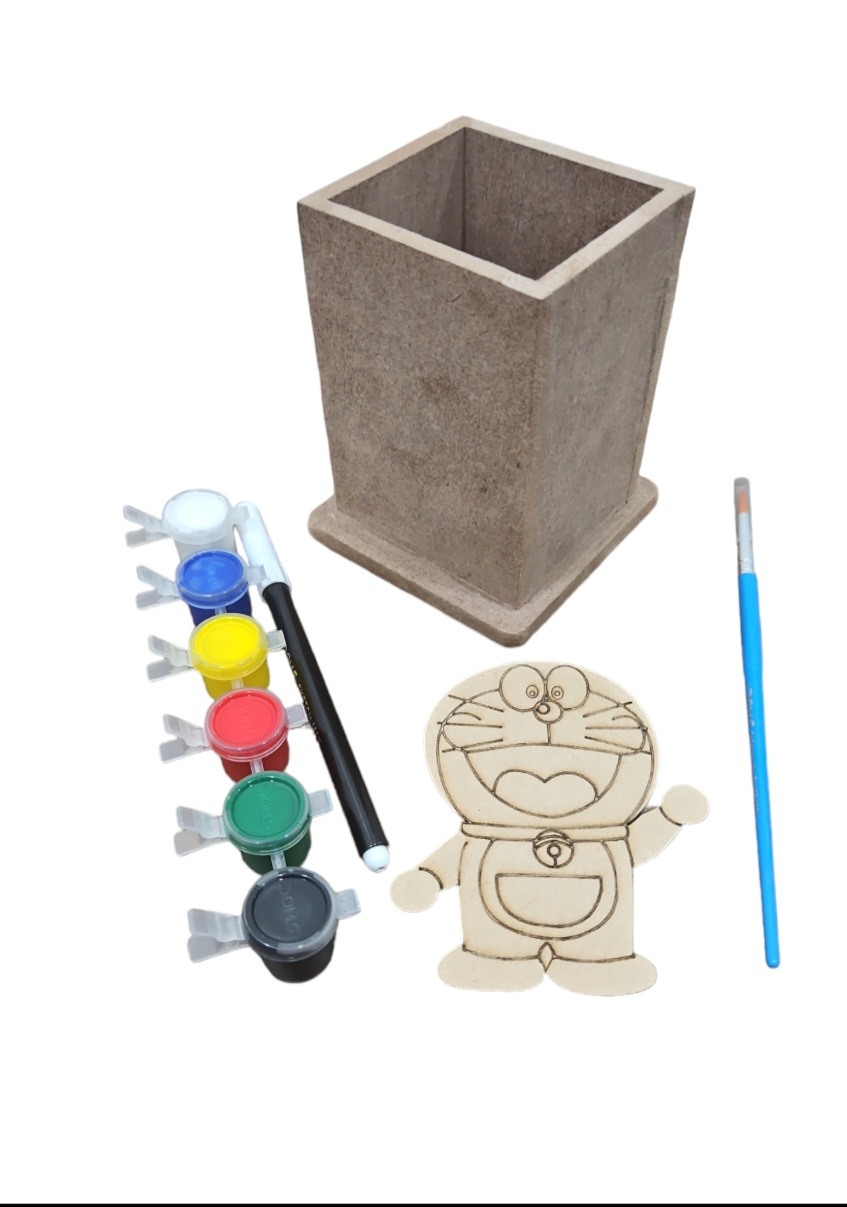 Adeckko DIY Doraemon Theme Penstand Coloring Kit Unlock your creativity with the Adeckko DIY Doraemon Theme Penstand Coloring Kit. This all-in-one kit offers a fun and engaging way to create your own custom penstand and fridge magnets, perfect for kids and adults alike who love Lego-themed projects. Kit Includes: Doraemon-Themed Penstand Piece : Easy-to-assemble blocks designed to form a sturdy and eye-catching penstand. Fridge Magnet Cutouts : Fun, Doraemon themed MDF shapes that you can color and personalize. Coloring Markers : A set of vibrant, high-quality markers to bring your designs to life. Magnetic Strips : Strong magnets to attach to the back of your fridge magnet cutouts, making them ready to display. Instruction Sheet : Step-by-step instructions to guide you through the assembly and coloring process. Features: Creative Customization : Personalize your penstand and fridge magnets with your favorite colors and designs. Durable Materials : Made from high-quality MDF, durable materials to ensure your creations last. Perfect Gift : Ideal for birthdays, holidays, and special occasions for crafters, kids, and Lego enthusiasts. Multi-Functional : Use the penstand to organize your desk and the magnets to decorate your fridge or any magnetic surface. Dimensions: Penstand : 4 x 3.5 inches (pre- assembled) Doremon Character - 4 inches Bring a splash of color and a touch of doremon fun to your workspace and home with the Adeckko DIY Doaremon Theme Penstand. This kit is the perfect blend of creativity and functionality, making it a great addition to any craft collection. Get yours today and start creating!