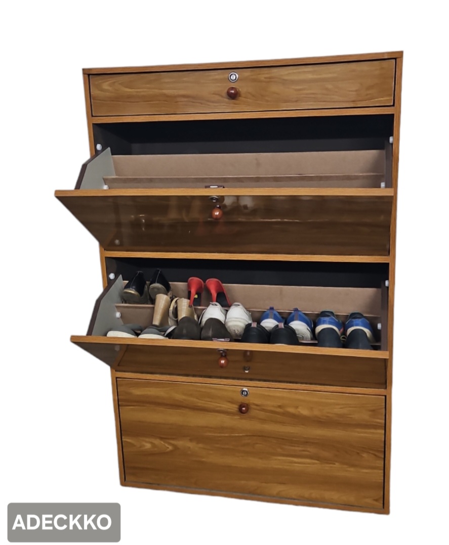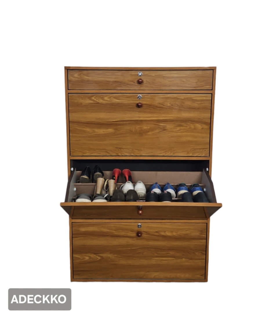 Keep your footwear well organized in the Adeckko Shoe Cabinet. It has an elegant design that can enhance any decor. Made of High Quality Plywood with premium laminate finish. Wooden Shoe Rack comes with 3 compartments With 3 Rows in each compartment, with a sleek Drawer. 40 Pair can easily accommodate. Material - PLYWOOD + LAMINATE Dimensions - Height : 54 inches Width : 36 inches Depth : 13 inches Pre-assembled - NO Assembly Required. For any customization contact us at 9999320028