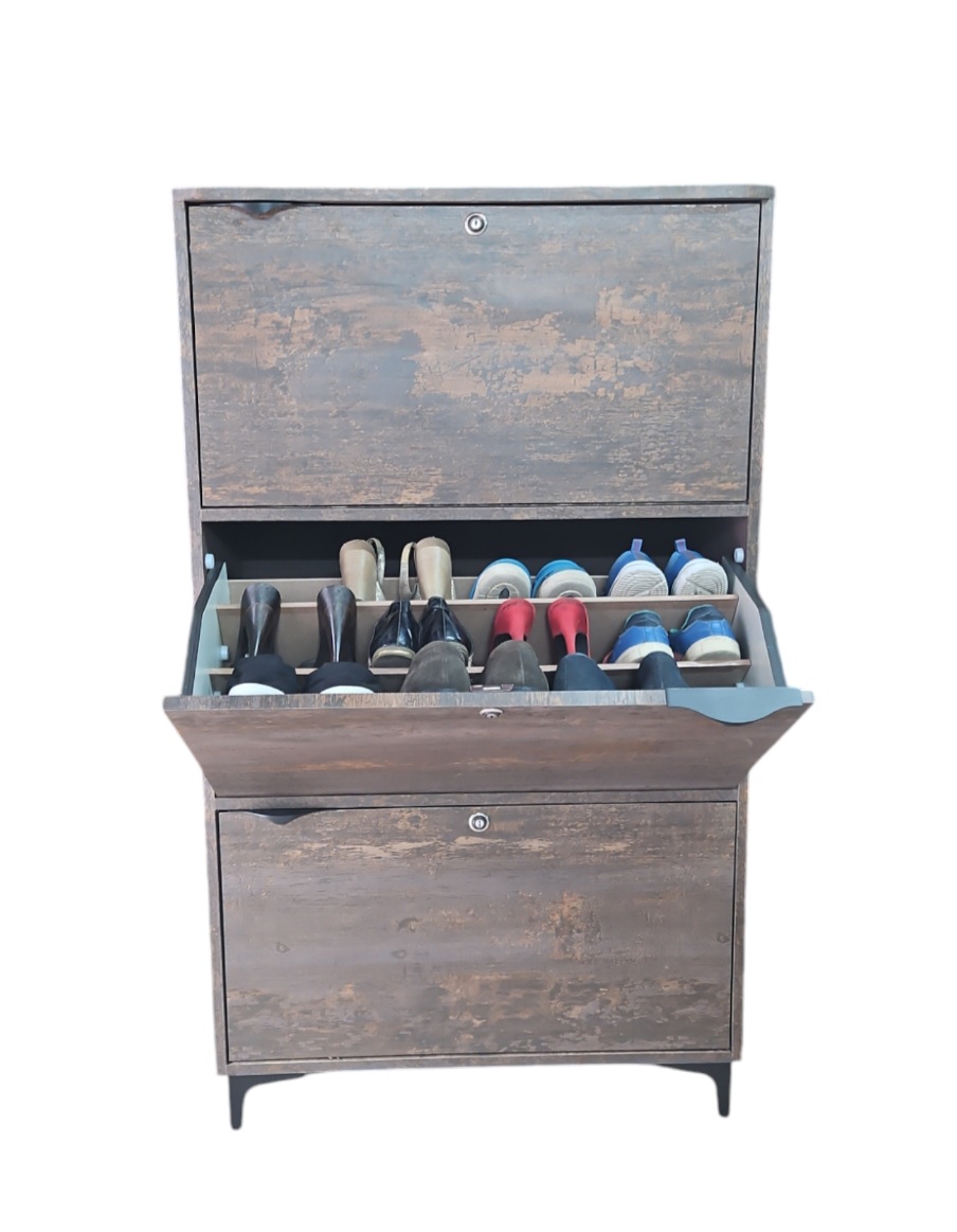 ADECKKO Rustic Brown Finish Shoe Rack Organize your footwear collection with the ADECKKO Rustic Brown Finish Shoe Rack, featuring 3 rotating compartments that make accessing your shoes effortless. With a capacity to accommodate 27-30 pairs**, this shoe rack is the perfect blend of style and functionality. The rustic brown finish adds a warm, earthy charm to your space, while the rotating compartments ensure optimal space-saving storage. Ideal for entryways, closets, or bedrooms, this versatile piece keeps your shoes organized and easily accessible while elevating your décor with its timeless rustic appeal. It's made of high quality heavy plywood and premium laminate finish. Height 51 inches , Width 30 inches , Depth 13 inches For customisation contact +91 9999320028