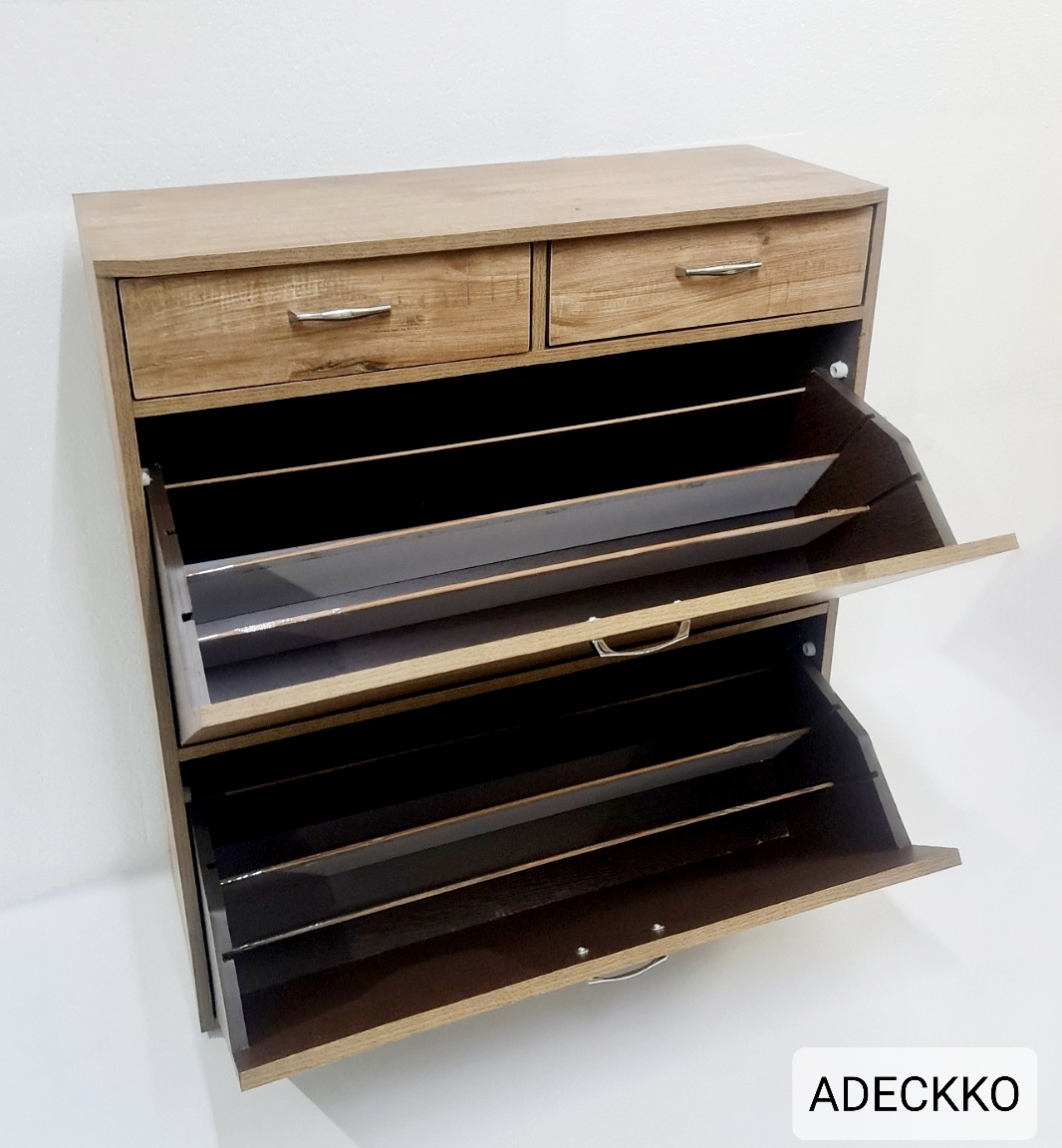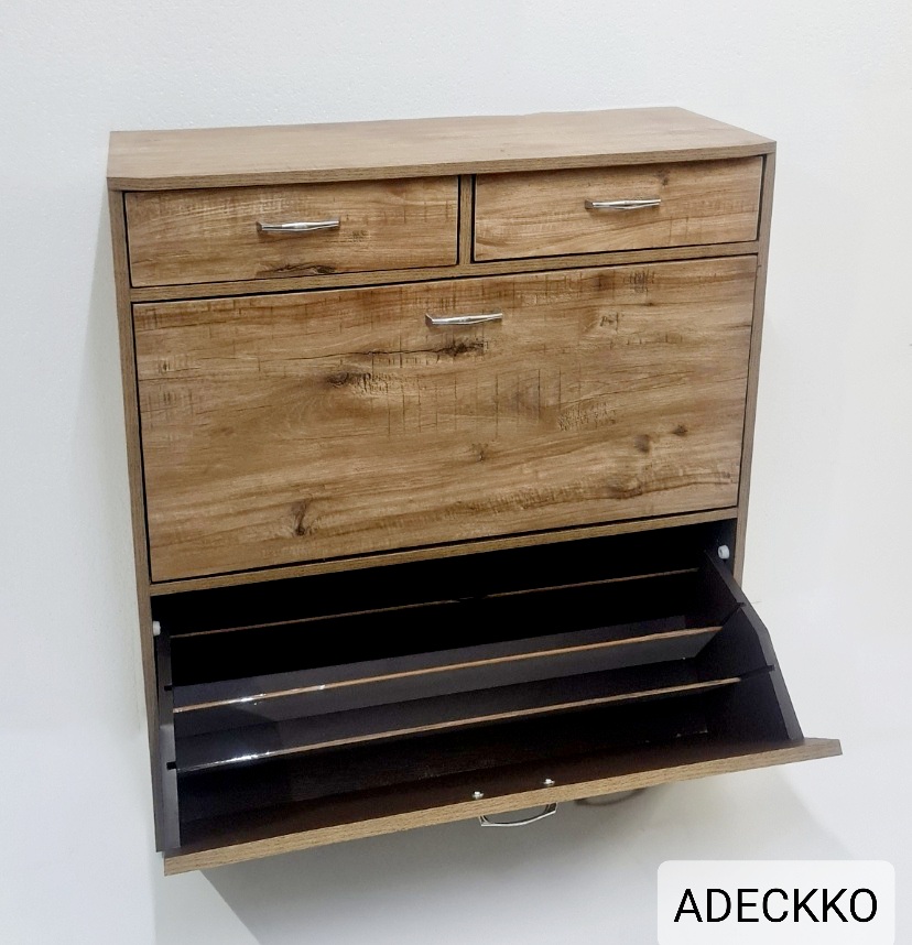 Keep your footwear well organized in the Adeckko Shoe Cabinet. This Shoe Rack is multifunctional and It has an elegant design that can enhance any decor. Made from High Quality Heavy Plywood with premium laminate finish. Cabinet can easily accomodate 24 Pair of Regular size shoes. This accent shoe cabinet is a great inclusion to an entryway, closet or living room. This sturdy and beautiful shoe rack is a great addition to any home. There are Two Compartments for shoe's and Two spacious Drawers. Material - PLYWOOD + LAMINATE Dimensions : Height : 40 inches Width : 30 inches Depth : 13 inches Pre-assembled - NO Assembly Required. For customization contact us at 9999320028