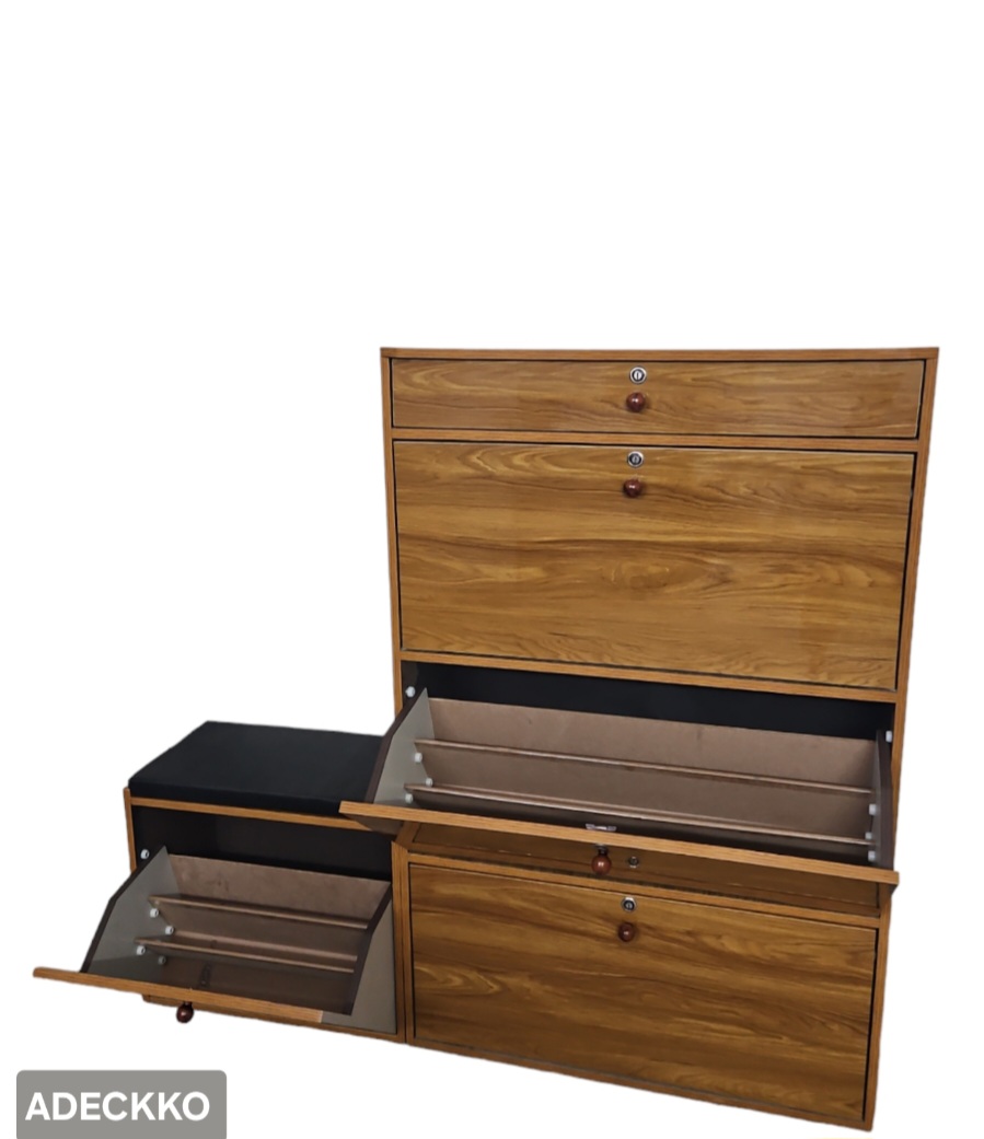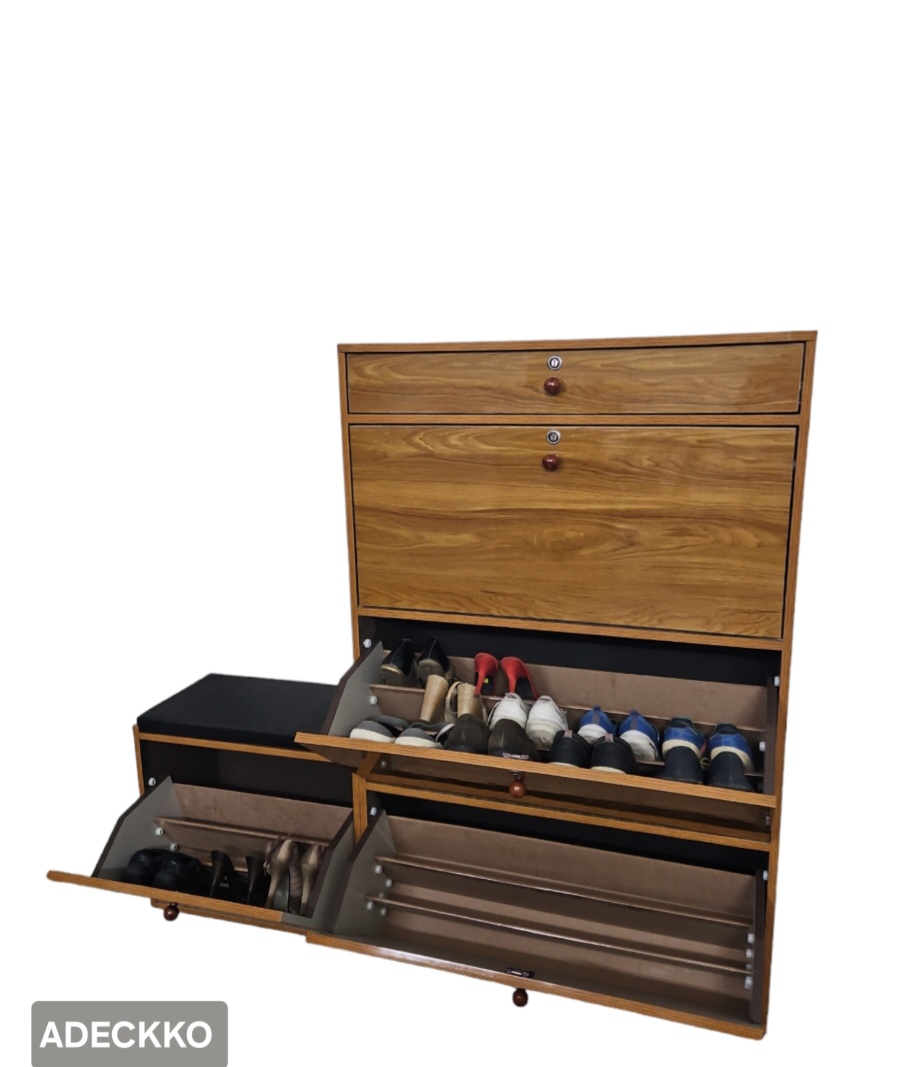 Keep your footwear well organized in the Adeckko Shoe Cabinet. It has an elegant design that can enhance any decor. 50 Pair Shoe Rack with Bench designed by Adeckko. Made of High Quality Plywood with premium laminate finish. Wooden Shoe Rack comes with 3 compartments With 3 Rows in each compartment, with a sleek Drawer. 50 Pair can easily accommodate. Material - PLYWOOD + LAMINATE Dimensions - Height : 56 inches Width : 36 inches Depth : 13 inches Bench : Height 20 inches Width 24 inches Depth 13 inches *Bench is Seperate ( You can keep any side ). Pre-assembled - NO Assembly Required. For any customization contact us at 9999320028
