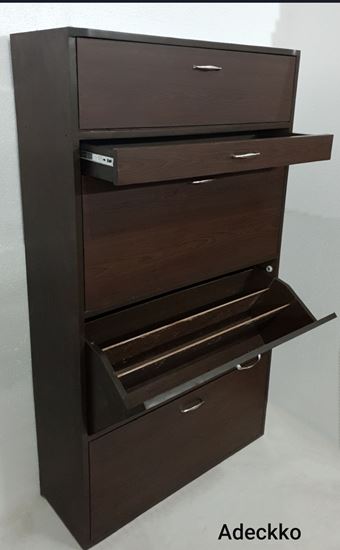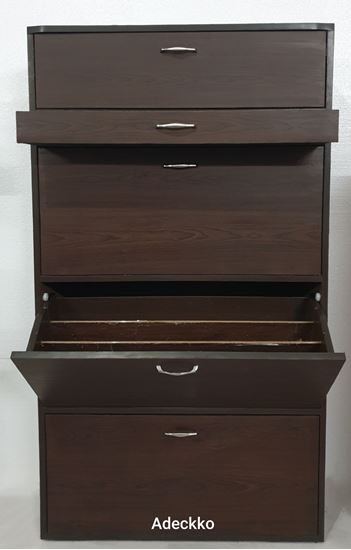 Keep your footwear well organized in the Adeckko Shoe Cabinet. This shoe rack is multi-functional . It has an elegant design that can enhance any decor. Made of High quality plywood with premium laminate finish. Shoe Rack Includes 5 layers with 4 racks and one drawer. It 3 Rotating Compartments with with 3 slots on both sides and 2 movable panel, You can adjust the panel according to your needs. In addition there is One Drawer and One Openable shelf. Material - PLYWOOD + LAMINATE Dimensions - Height : 64 inches Width. : 36 inches Depth. : 13 inches Pre-assembled - NO Assembly Required. For customization contact us at 9999320028