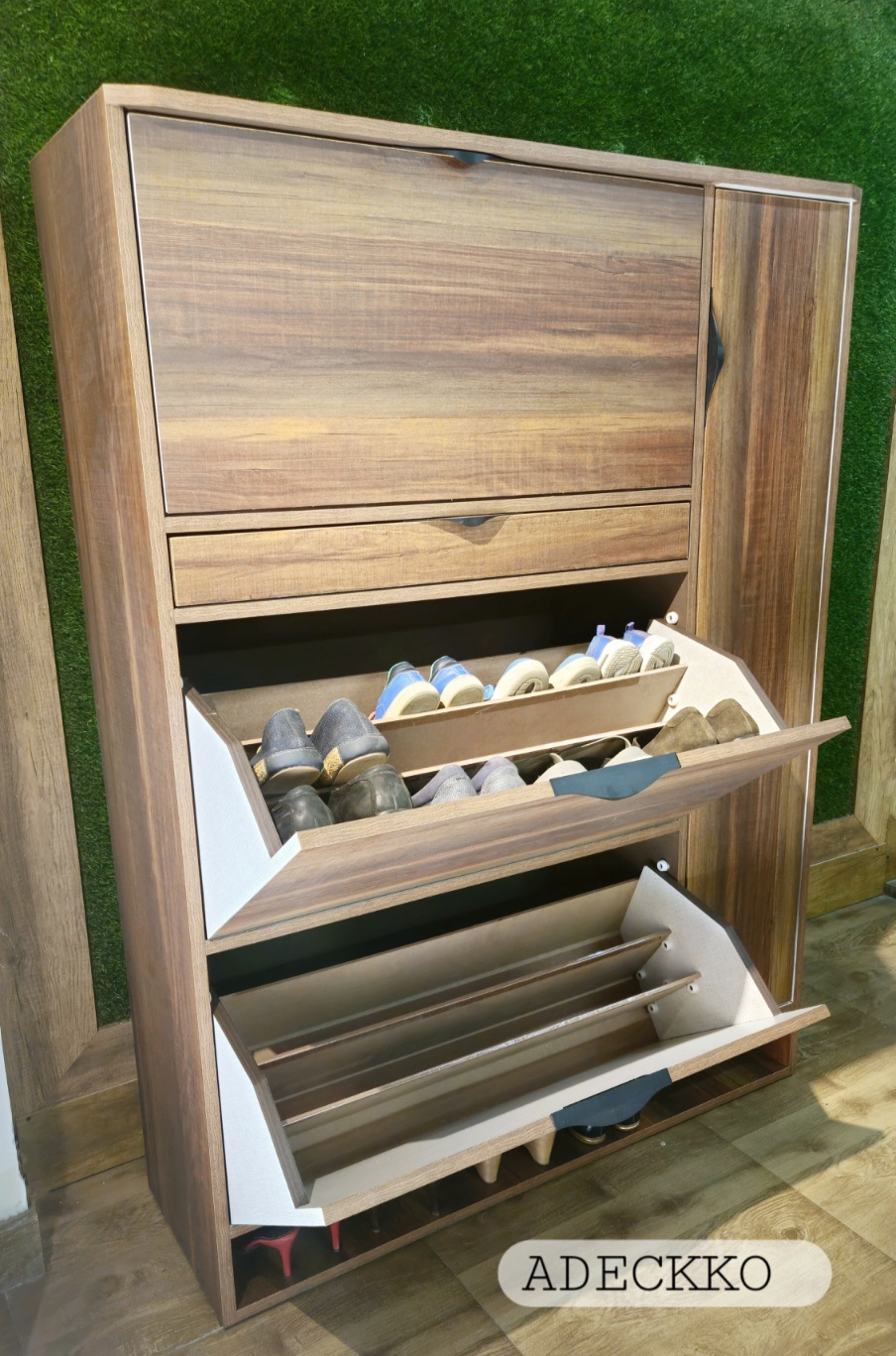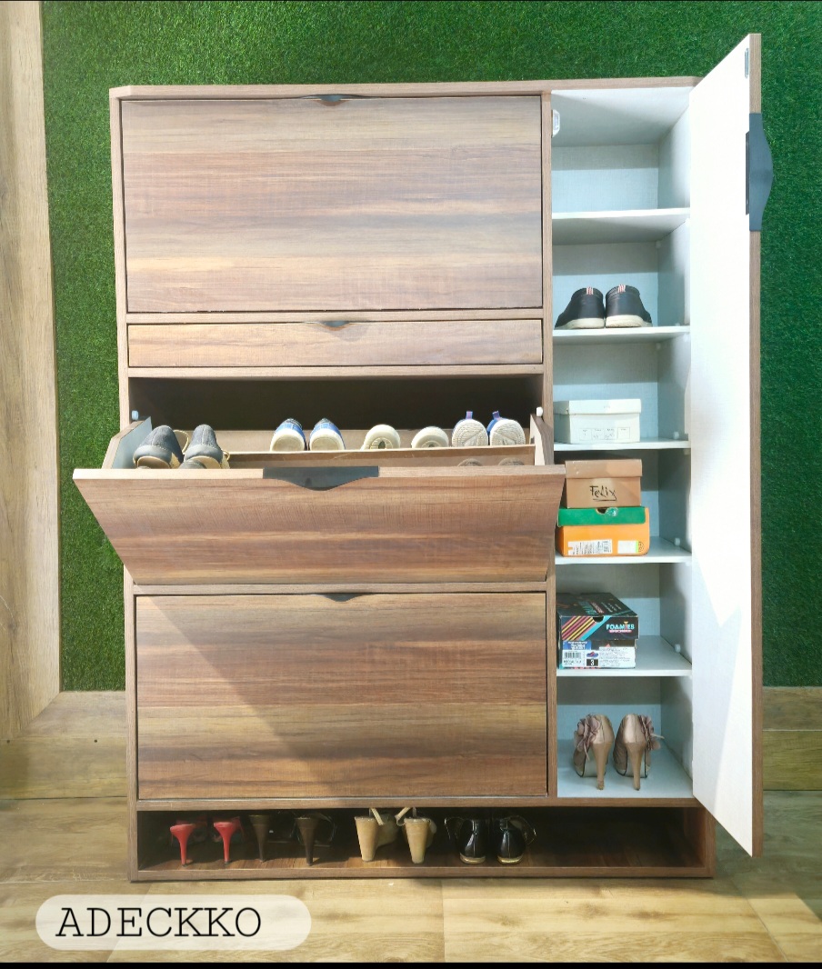 If you find yourself stepping on your shoes more often than you’re stepping into them, it’s time for a storage solution! This cabinet, sized to fit neatly into the entryway or mudroom, is a perfect pick. Almost 50 pair can easily accommodate. Its made of Plywood with premium Laminate Finish. It comes up with Three Rotating Compartments & There is a single door at sides with detachable shelves with one storage drawer. Material - PLYWOOD + LAMINATE Dimensions - Height : 58 inches Width : 48 inches Depth : 13 inches Pre-assembled - NO Assembly Required. For customization contact 9999320028.