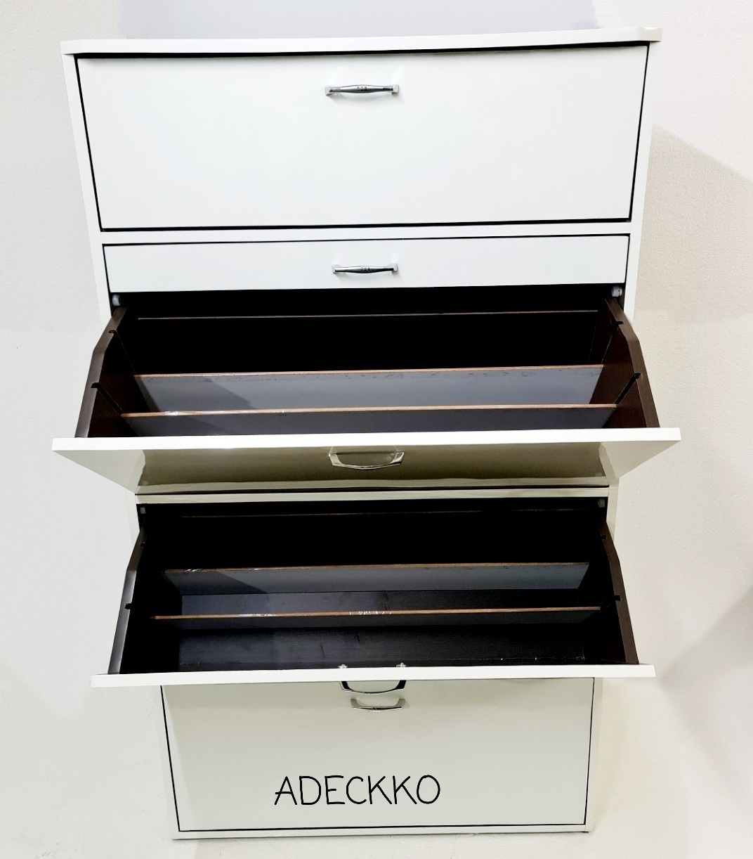 Keep your footwear well organized in the Adeckko Shoe Cabinet. This shoe rack is multi-functional . Shoe Rack comes with 3 spacious compartments with one openable shelf and a drawer. It has an elegant design that can enhance any decor. Made of High quality plywood with premium laminate finish. Material - PLYWOOD + LAMINATE Dimensions - Height : 64 inches Width. : 36 inches Depth. : 13 inches Pre-assembled - NO Assembly Required. For customization contact us at 9999320028