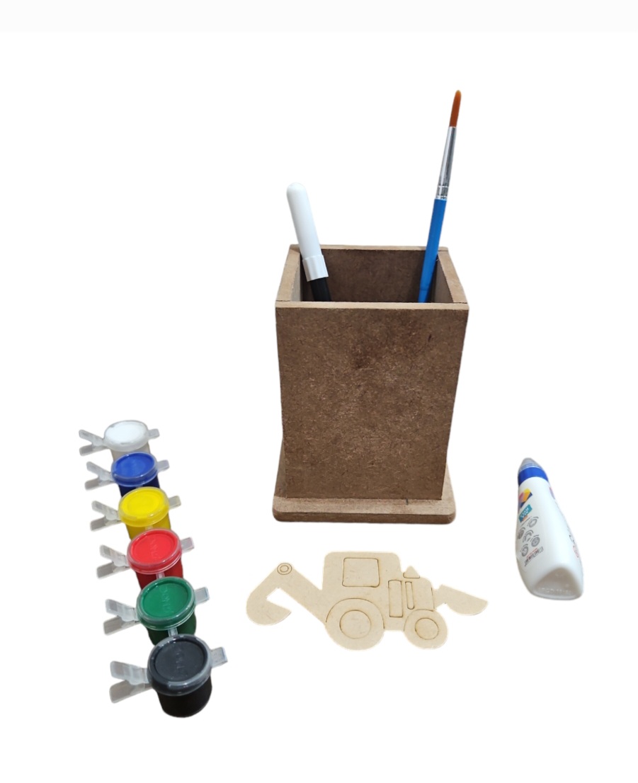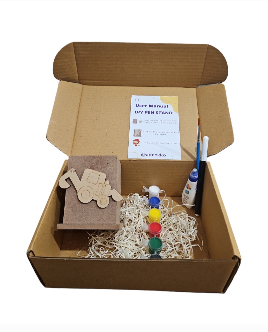 Build and customize your own loader pen stand with this fun DIY project. Unleash your creativity and organizational skills with the Adeckko DIY Construction Vehicle Theme Coloring Kit. This unique and fun kit combines the joy of building with the therapeutic benefits of coloring, creating a personalized and functional pen stand that reflects your style. Kit Includes: Loader -Themed Pen Stand & Cut Out : Pre Assembeld pen stand & Cutout. Coloring Markers: A set of vibrant, high-quality markers for coloring the pen stand pieces, allowing you to customize your creation. Instruction Sheet : Step-by-step instructions to guide. Customize your pen stand with your favorite colors and designs. Durable Materials : Made from high-quality MDF, durable materials to ensure your pen stand lasts. Gift: Perfect for kids, students, artists, and anyone who loves DIY projects. Compact Design: Ideal for desks, study areas, or any workspace that needs a touch of personalization and organization.Create a one-of-a-kind pen stand that not only keeps your pens, pencils, and markers in order but also adds a playful and colorful touch to your workspace. The Adeckko DIY construction vehicle Theme Coloring Kit is the perfect blend of fun and function. Get yours today and start building your creativity! For Customisation contact 9999320028