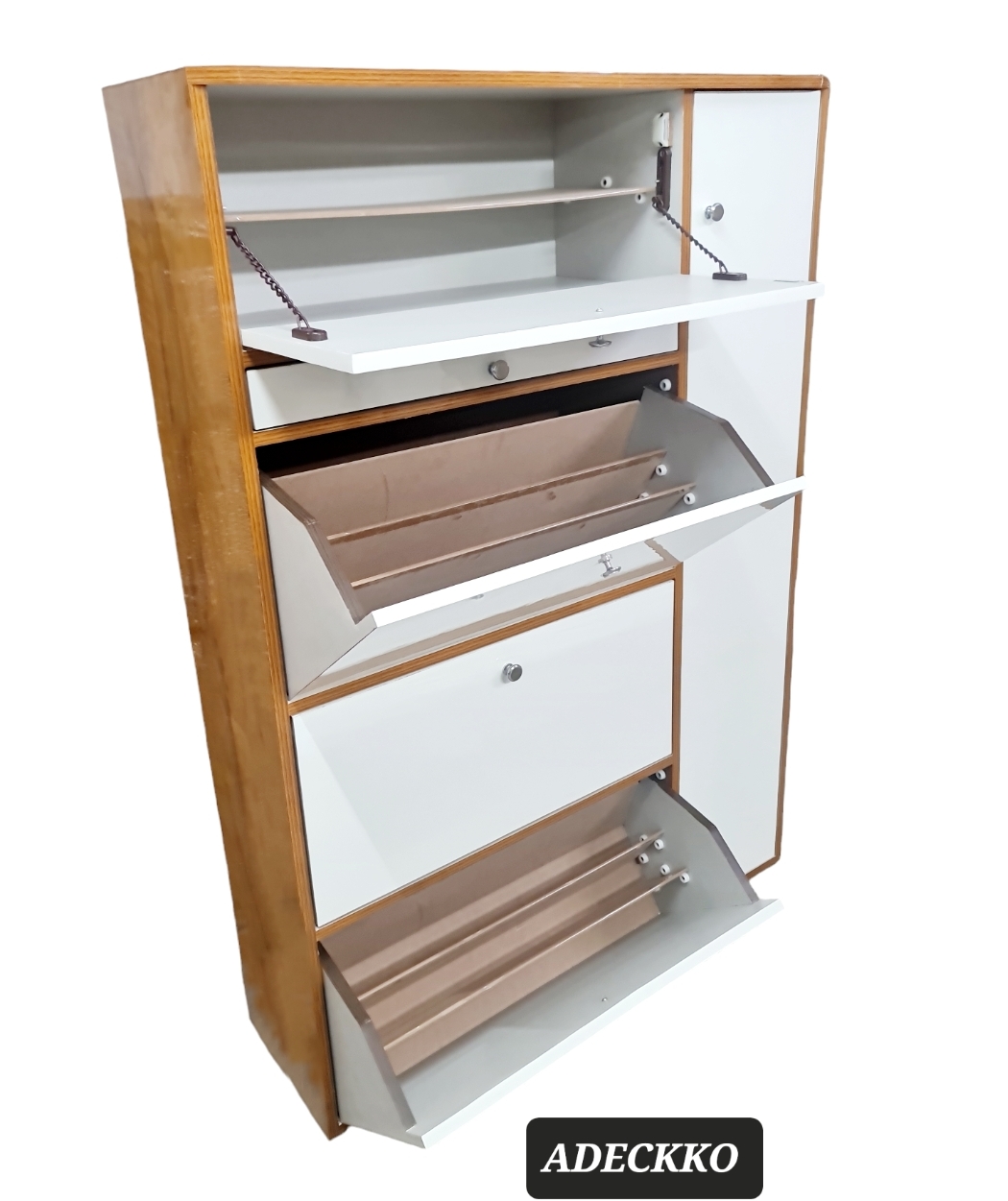 Organize your heels, sandals, sneakers, trainers, boots, work shoes and more with this cabinet. It will make finding your favourite pair of heels so much easier as well. Wooden Shoe Rack Includes 3 rotating compartments with 3 rows, sleek drawer and a side door storage unit to keep shoes with box . You can adjust the panel according to your needs. Made of High Quality Heavy Plywood with Premium Laminate Finish. Material - PLYWOOD + LAMINATE Dimensions - Height : 68 inches Width : 38 inches Depth : 13 inches. Pre-assembled - NO Assembly Required. For customization contact us at 9999320028