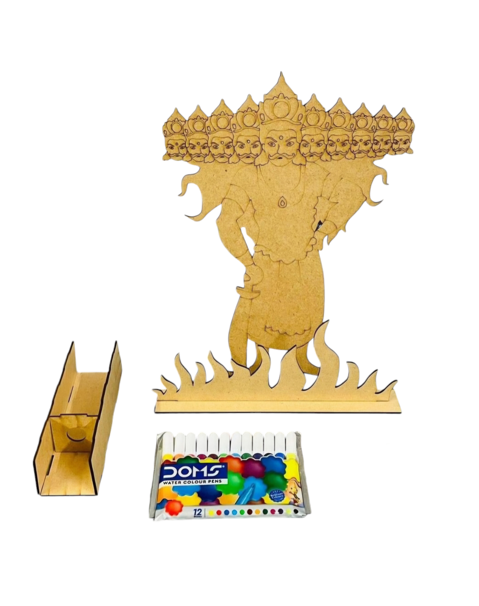 Unleash your creativity this Dusshera with our Ravan DIY Kit, now featuring a complete coloring kit! Paint and personalize your own Ravan, adding a unique touch to your festive celebrations. A perfect blend of fun and tradition for the whole family! Durable MDF Material: The Ravan cutout is made from 2.8mm thick MDF, ensuring durability and ease of handling. The smooth surface allows for easy painting, gluing, and decorating, making it great for DIY enthusiasts. Unfinished Design for Personalization: This MDF cutout is unfinished, making it easy to paint, stain, or embellish to suit your decor style. It's a versatile piece for creative festive craft activities for both kids and adults. Perfect for Home & Festival Decorations: Add a cultural touch to your home with this Ravan cutout. It makes a striking statement for Dussehra, stage decorations, and even classroom projects for teaching Indian mythology. Multi-Use Craft Supply: This MDF cutout is ideal for various crafting purposes—be it for festival decor, DIY home decoration, or religious-themed activities in schools. Kids will love to get creative with it during festive seasons.
