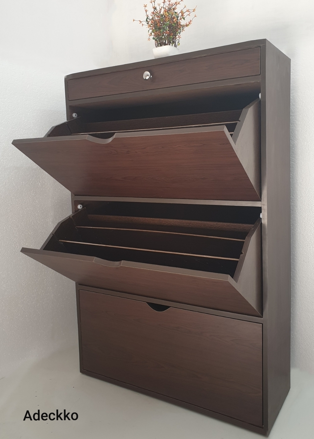 Organise your heels, sandals, sneakers, trainers, boots, work shoes and more with this cabinet. It will make finding your favourite pair of heels so much easier as well. Wooden Shoe Rack Includes 3 layers with 3 racks and one drawer. Each layer has 3 shoe racks with 3 slots on both sides and 2 movable panel, You can adjust the panel according to your needs. Max stoarge 40 Pair of Shoes. Made of High Quality Heavy Plywood with Premium Laminate Finish. Material - PLYWOOD + LAMINATE Dimesnions - Height : 54 inches Width : 36 inches Depth : 13 inches. Pre-assembled - NO Assembly Required. For customization contact us at 9999320028