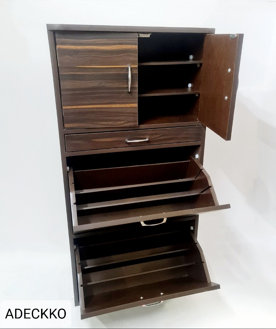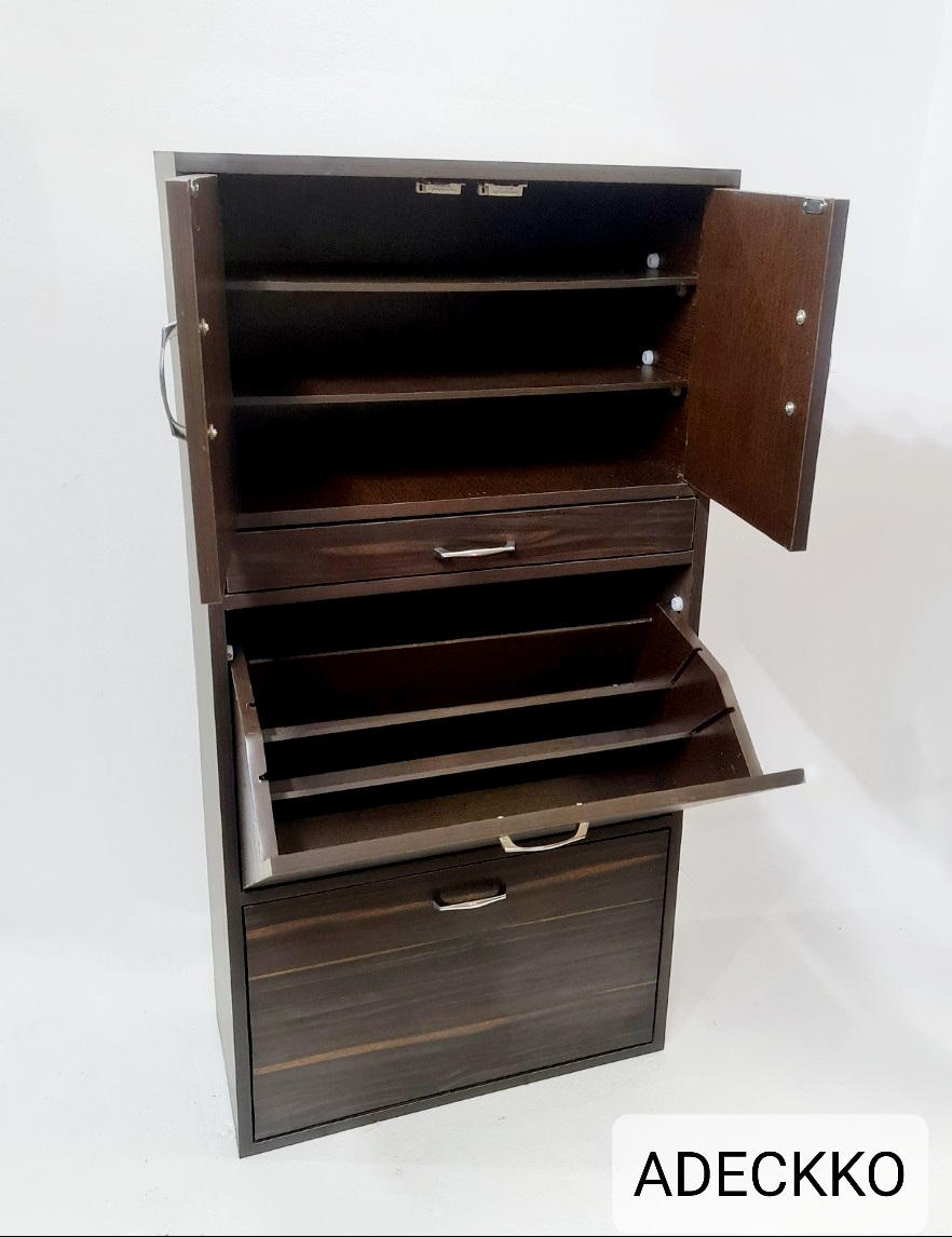 Organize your heels, sandals, sneakers, trainers, boots, work shoes and more with this cabinet. It will make finding your favourite pair of heels so much easier as well.Wooden Shoe Rack Includes 2 rotating compartments with 3 racks and one drawer. Each layer has 3 shoe racks with 3 slots on both sides and 2 movable panel, You can adjust the panel according to your needs. Max storage 24 Pair of Shoes. Made of High Quality Heavy Plywood with Premium Laminate Finish. Material - PLYWOOD + LAMINATE Dimensions - Height : 51 inches Width : 24 inches Depth : 13 inches. Pre-assembled - NO Assembly Required. For customization contact us at 9999320028