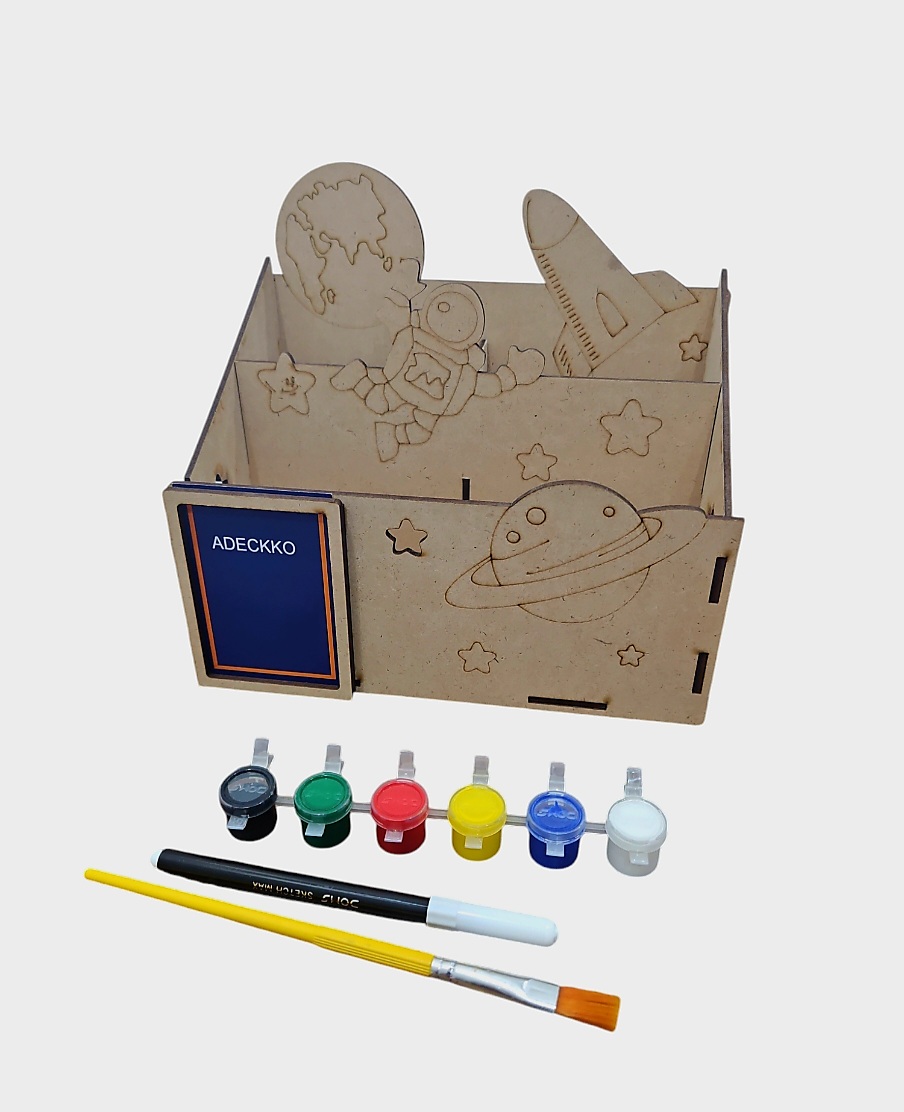 Space Theme Stationary Holder DIY Coloring Kit for Kids with Built-In Photo Frame Ignite your child’s creativity and imagination with our Space Theme Stationary Holder DIY Coloring Kit, now with a built-in photo frame! This exciting kit lets kids explore the wonders of the universe while crafting their very own stationary holder featuring planets, rockets, stars, and astronauts. The added photo frame allows your child to display a favorite picture, making it a personal and functional keepsake. Complete with coloring supplies, the kit encourages fine self-expression as kids color and customize their holder. The stationary organizer is perfect for keeping pencils, pens, and art supplies neatly in place, while the photo frame adds a personal touch to their space-themed creation. Whether as a fun weekend project or a thoughtful gift, this kit is the perfect way to blend creativity, learning, and organization in one stellar package! Dimensions : Height 9 inches Width 9 inches Depth 5 inches For customisation contact +91 9999320028